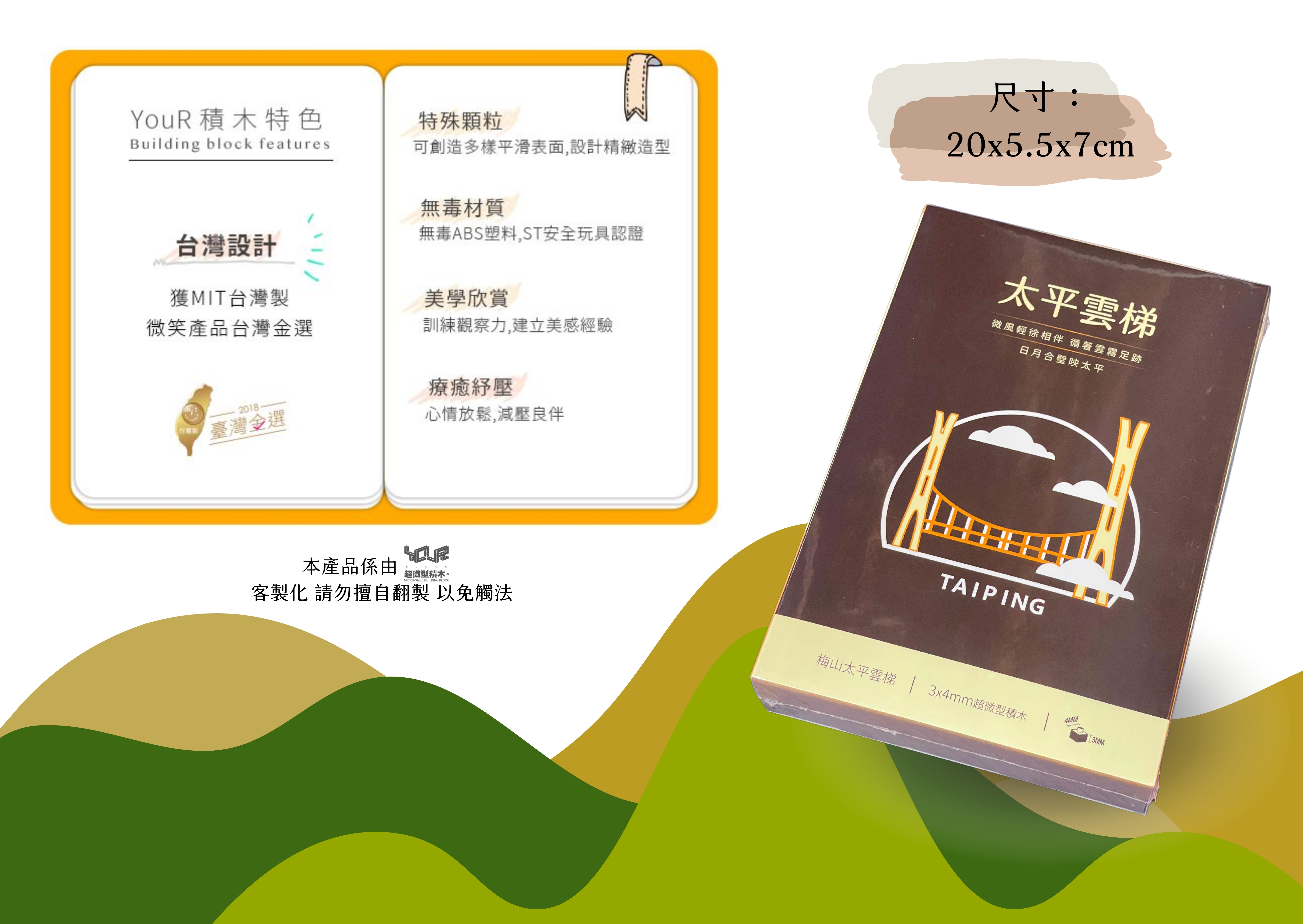擬真樂高原型來自太平雲梯本體,從空拍建模,到橋體構件繪製,幾經波折及困難,藉由小小構件的拼湊,希望能帶給更多人美好溫暖的想望。